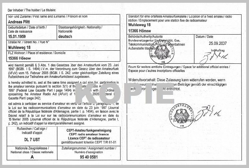 Bevor aber ein Funkamateur loslegen kann, muss er sich bei der Behörde einer staatlichen Prüfung unterziehen. Funkgeräte gibt es fertig zu kaufen aber - und das ist ein wesentlicher Aspekt - wir dürfen unser gesamtes Equipment selber bauen - angefangen vom Funkgerät bis hin zur Antenne. Das hierfür nötige Grundwissen erhalten wir bei Lehrgängen, die von qualifizierten Funkamateuren aus den Ortsverbänden durchgeführt werden. Nach bestandener Prüfung bekommt man sein persönliches, weltweit einmaliges Rufzeichen, bei mir war das am 27.November 1991.
